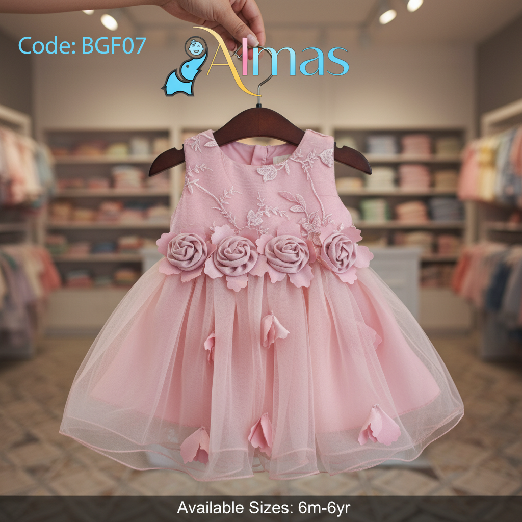 Luxury Pink Rose Frock (৬ মাস – ৬ বছর) – রোজ ফ্লাওয়ার ডিজাইন ও প্রিমিয়াম ফ্যাব্রিকের লাক্সারি পার্টি ওয়্যার।