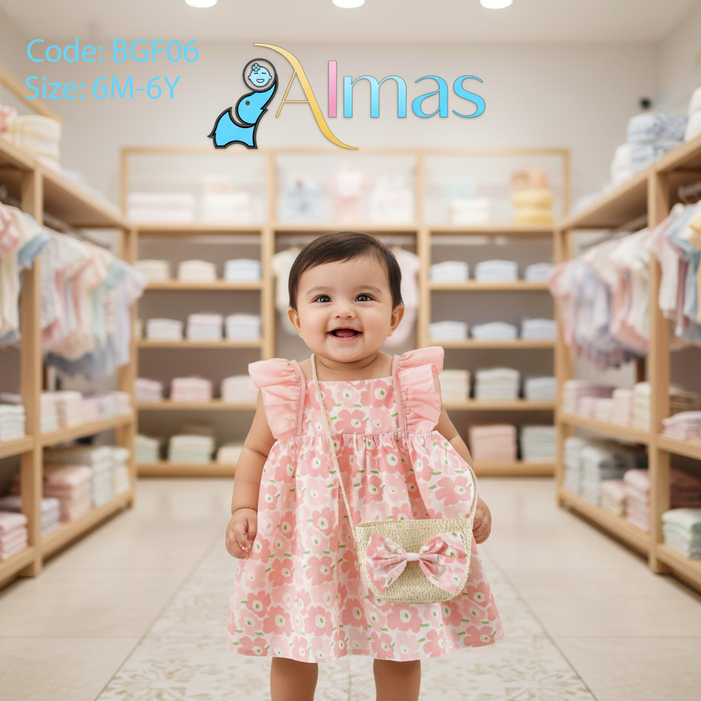 ফ্লোরাল ডিজাইনের পিঙ্ক ফ্রক, সাথে কিউট ছোট্ট ব্যাগ। স্টাইলিশ ও আরামদায়ক।